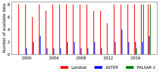 Table 1 summarizes all sensor characteristics and preprocessing, and Figure 3 illustrates the annual data availability for 1.5-month intervals (i.e., the largest amount corresponds to eight data points per year). Landsat was a main data source throughout the entire period while ASTER and PALSAR-2 provided complementary information to fill the gaps of Landsat.