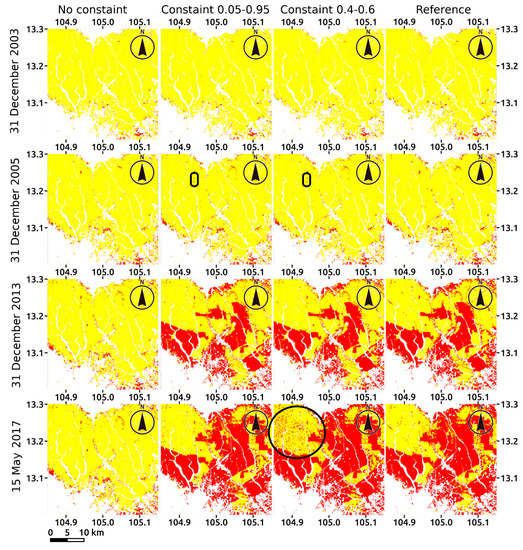 Effect of the constraint of the posterior probability. (From the left column) The no-constraint map, the constraint map with a range of 0.05–0.95, the constraint map with a range of 0.4–0.6, and the reference map are shown for different dates (31 December, 2003; 31 December, 2005; 31 December, 2013; and 15 May, 2017 from the top). Red: deforestation; yellow: forest; white: nonforest mask. The circled areas in black show the error detection of deforestation.