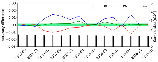 Accuracy difference of deforestation land-cover maps between BULC and Landsat-only algorithms from 2017–2018. UA: user’s accuracy; PA: producer’s accuracy; OA: overall accuracy. The light-green band shows the uncertainty of the overall accuracy. The black and gray bars represent the number of sampled pixels (× 105) for BULC and Landsat, respectively. Approximately 130 thousand pixels were randomly sampled for each class (forest/deforestation) for the validation.