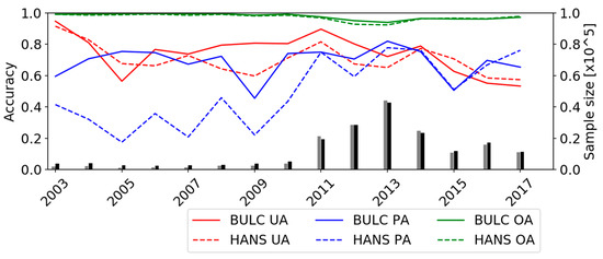 Comparison of accuracies of yearly change-detection maps between our algorithm and the algorithm of Hansen et al. [12]. UA: user’s accuracy; PA: producer’s accuracy; OA: overall accuracy; BULC: our algorithm; HANS: product of Hansen et al. [12]. The black and gray bars represent the number of sampled pixels (× 105) for BULC and Landsat, respectively.