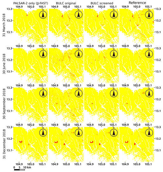 Apparently, our maps were more consistent to the reference maps than the JAXA maps, which were only based on PALSAR-2. JAXA maps mostly had small (but over 3 ha) deforestation omissions and occasionally large omissions (e.g., in 30 September, 2018 in Figure 9), thereby suggesting that the integration of optical sensors with PALSAR-2 compensated for the relatively coarser spatial resolution and speckle-noise effect of PALSAR-2. This resulted in a more realistic detection of deforestation. On the contrary, erroneous small patches were detected in the original (i.e., not screened) BULC maps, particularly on 30 June and 30 September in 2018. The noise seemed to be treated by a screening method by the JAXA products. This suggests that post-processing, such as the screening of small deforestation patches, and expansion/contraction treatments may also be effective in improving the accuracy of the end result.