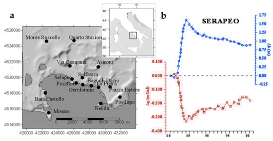(a) Location of survey benchmarks for repeated gravity and leveling in Campi Flegrei. (b) Temporal changes for gravity (red) and elevation (blue) at Serapeo from 1980 to 2000. The vertical dimension of the symbols is representative of the errors. A high correlation is observed between both data types, but the elevation values show a more continuous pattern. Modified from [].