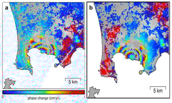 (a) LOS deformation velocity computed from ascending passes for the period 1993–2000 and (b) LOS deformation velocity computed from descending passes for the period 1992–2000. Modified from [].