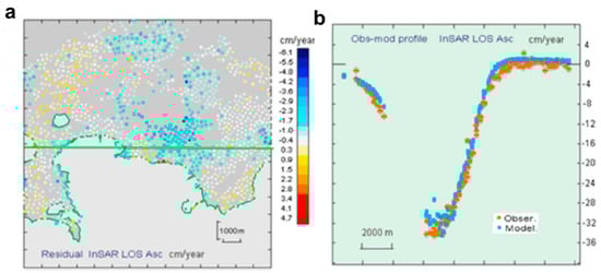 Some additional views of the LOS ascending data fit: (a) residual map and (b) WE central profile for observed-modeled comparison [].