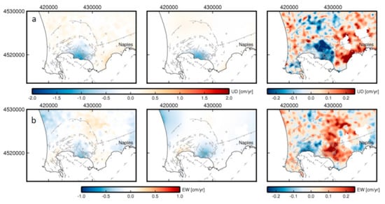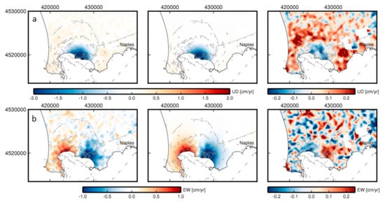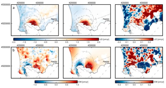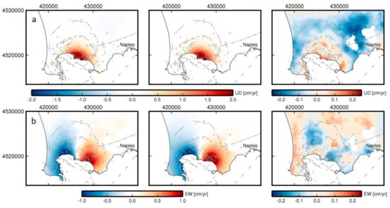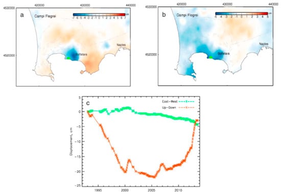 For the same area, Campi Flegrei, Small Baseline Subset (SBAS) results (linear velocity and displacement time series) were obtained from a set of 165 European Remote Sensing Satellites 1 and 2 (ERS-1 and ERS-2), and 62 ENVISAT SAR data acquired between 1992 and 2008 on ascending (track 129, frame 809) and descending (track 36, frame 2781) orbits []. Camacho et al. [] use a temporal subset of this data set overlapped with the common time span of the leveling and microgravity data. In particular, data were limited to the periods 1992–2000 for the descending pass and 1993–2000 for the ascending pass.