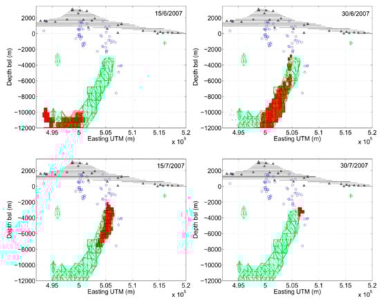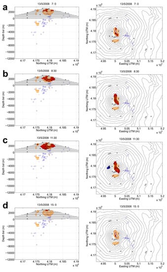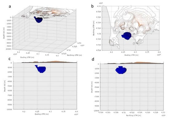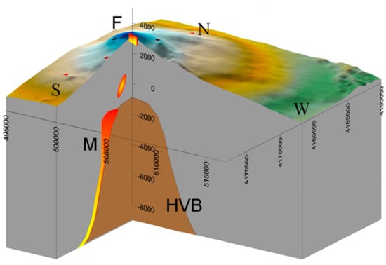All deformation data (terrestrial, ascending, and descending DInSAR) provide a similar low-pressure structure located at a shallow depth (about 1500 m) below the survey area []. The shape of that structure nearly fills the bottom of a parabolic cup with the same additional filling in the walls (Figure 3). Therefore, they did not detect signs of the deep magmatic source for this period. Some main WNW–ESE elongation is detected at about N100°E. The parabolic cup is superimposed with depth on the shape of some existing structure, namely the inner caldera edge, as depicted by a 2.5-D inversion of on-land and offshore gravity data []. Moreover, its bottom corresponds to the depth of the bottom of the inner caldera (between 2 and 2.5 km). The modeled structure fits well the polygenic body inside the caldera. We interpret this as corresponding to the dynamics of the shallow (depth 1–2 km) hydrothermal system, as previously suggested by several authors [,,]. The hydrothermal system is confined to the filling caldera materials and is limited by the inner caldera structure.