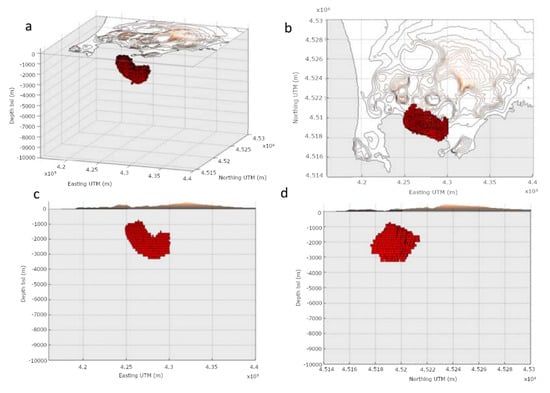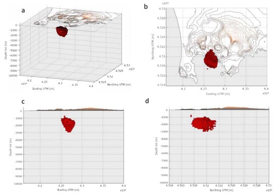 Camacho et al. [] developed an original methodology aimed at the determination of the 3D geometry and location of the causative bodies by inverting ground deformations and gravity changes due to pressure and/or mass anomalies embedded into an elastic medium. Such a fully nonlinear inversion has led to interesting results in volcanic environments, where ground deformations are related to over-pressured magmatic bodies [,,] or water extraction []. This methodology can be used to invert geodetic remote sensing data or terrestrial data alone, or in combination.