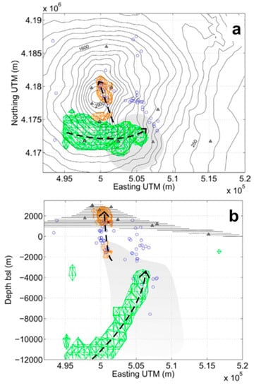 In a volcanic context, surface displacements are inverted to infer valuable constraints on the active magmatic sources [,,,]. Surface deformation is a direct consequence of the dynamics of volcanic plumbing systems, and reflect the shape of magma intrusions, the volume of intruding/arising magma, and the emplacement mechanisms.