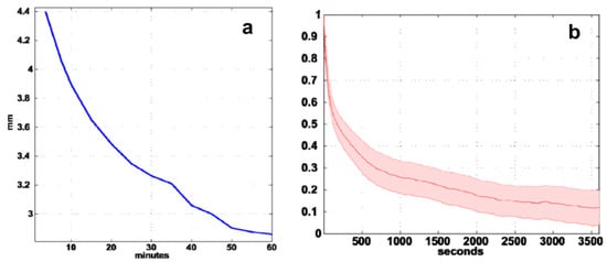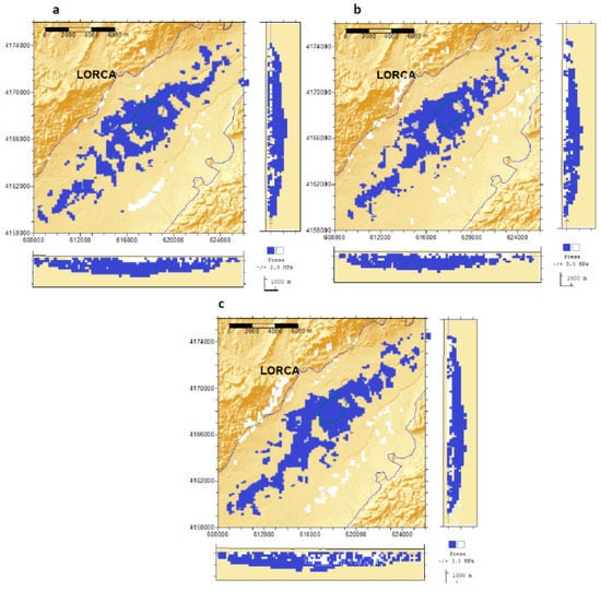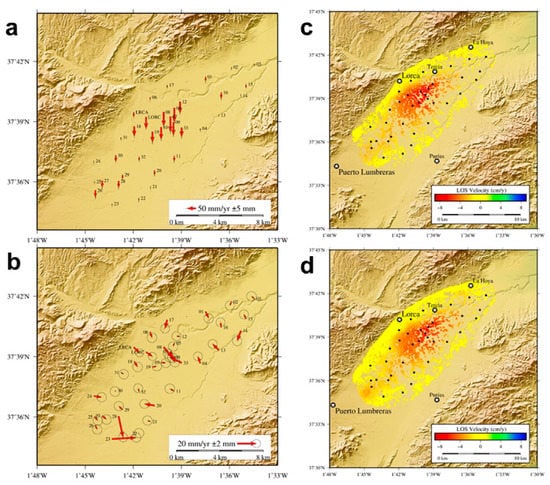 Ascending and descending deformation linear rate maps are shown in Figure 2. Both maps show a roughly circular pattern of subsidence (increase in line-of-sight phase change) with maximum average velocities larger than 3 cm/yr. Despite some minor uplift [], the linear velocity during the whole period 1992–2000 is negative. Linear ground deformation rate and time series evolution have been extensively validated against independent geodetic techniques []. The global precisions of the SBAS results were determined to be ±0.5 cm and ±0.1 cm/yr for the linear ground deformation rate and time series displacement evolution, respectively []. See Camacho et al. [] for more details in the DInSAR data sets.