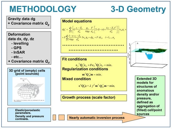 Typically, modeling of deformation and gravity change follows an inverse approach using analytical solutions for volume change or shear faulting within an elastic half space-computationally efficient methods that provide insight into the depth, geometry, and strength of subsurface magma bodies and slipping faults [,]. Normally, regular geometries (point sources, disks, prolate or oblate spheroids, etc.) are assumed at the initial stages [] and the resulting inversion is carried out in a linear context.