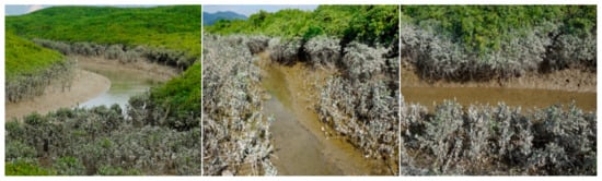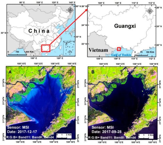 The study area, Zhenzhu Harbor (21°28′–21°42′N and 108°00′–108°20′N), is located in Guangxi Province, China, in the southwest portion of mainland China and the north region of Tonkin Gulf (Figure 1). In Zhenzhu Harbor, mangrove forests are mainly composed of four communities: Comm. A. marina, Comm. A. corniculatum, Comm. A. marina–A. corniculatum, and Comm. K. candel–A. corniculatum. The tides in the coast of Zhenzhu Harbor are diurnal, with an average tidal range of 2.24 m, and mangrove forests here are primarily younger shrubs with an average height of less than 3 m []. Therefore, the Zhenzhu Harbor is a typical area for the study of submerged mangrove forests, due to a large area of pioneer mangrove trees and shrubs that would be entirely submerged during high tides (Figure 1A,B). Information of MSI images we selected are shown in Table 2.