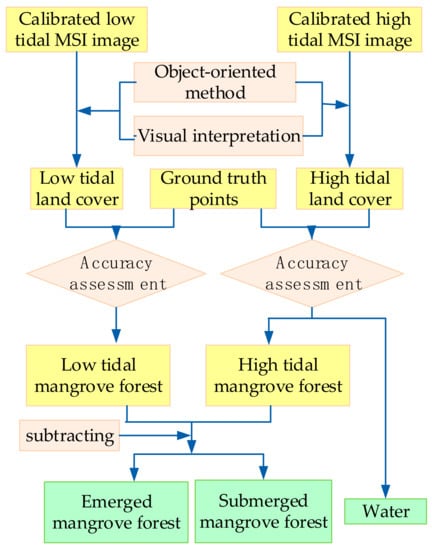 The spectral curves of water, submerged mangrove forests, and emerged mangrove forests were extracted from images. The workflow of discriminating these classes is shown in Figure 2. A reference map was built based on object-oriented methods and visual interpretation.