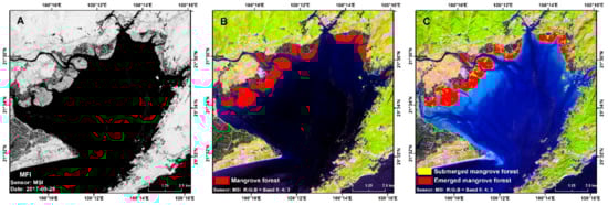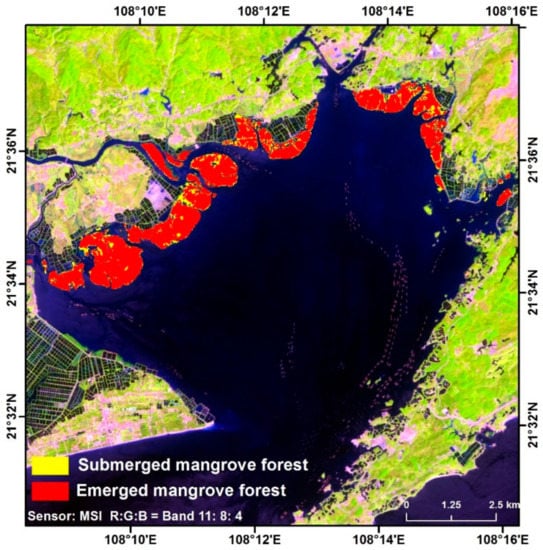 Over the last two decades, remote sensing of submerged and emerged aquatic vegetation has been widely studied [,]. Hyperspectral image with numerous narrow and contiguous bands is reliable for studying aquatic vegetation and is able to detect the biophysical properties of vegetation efficiently [,,,]. However, there is no freely available satellite hyperspectral data in recent years, and airborne applications are exorbitantly expensive and only cover a very small spatial extent. Landsat images with moderate spatial resolution of 30–60 m have been widely used for mapping aquatic vegetation [,,,,]. Yet, Landsat only has one band in the spectral region of near infrared (760–900 nm), which may become less sensitive as water depth increases []. The MODIS (Moderate Resolution Imaging Spectroradiometer) and AVHRR (Advanced Very High Resolution Radiometer) are publicly available with high spectral resolution but coarse spatial resolution (250–1100 m, respectively), making them unsuitable for mangrove detection []. In contrast, the Sentinel-2 MultiSpectral Instrument (MSI) sensor has a 10–20 m spatial resolution and five bands in near infrared region, which provides opportunities to conduct quick, robust, and efficient monitoring of submerged mangrove forests.