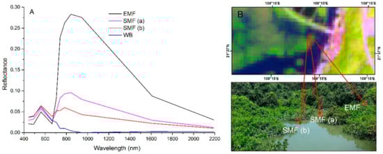 (A) Typical spectral curves of emerged (EMF), submerged mangrove forests (SMF) and water (WB) in Sentinel-2A MSI image. (B) EMF and SMF forests in Sentinel MSI image and field photo. (a) Represents shallow submerged mangrove forests (0–30 cm), (b) Represents deep submerged mangrove forests (30–60 cm).