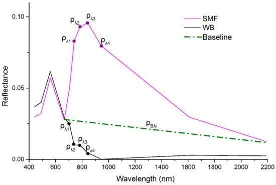 For this study, according to the analysis in Section 2.4, the absorption valleys in band 4 (centered 665 nm) and band 12 (centered 2190 nm) could be used to form a baseline (Figure 6). In order to enhance the stability of differences between submerged mangrove forests and the water background, the average value of reflectance of band 5 (centered 705 nm), band 6 (centered 740 nm), band 7 (centered 783 nm), and band 8A (centered 865 nm) above the baseline, is defined as MFI. Band 8 was excluded because Bands 7 (centered 783 nm) and 8A (centered 865 nm) covered most of its spectra, and its spectral range overlaps with the water absorption region. The mathematical formulation is