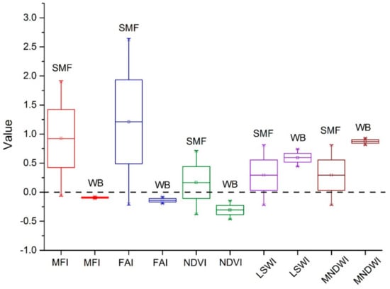 Boxplot of different index values over submerged mangrove forest pixels and water pixels (MFI and Floating Algae Index (FAI) are 10 times their original value. SMF means submerged mangrove forest, WB means Water Body. The horizontal axis represents different indices).