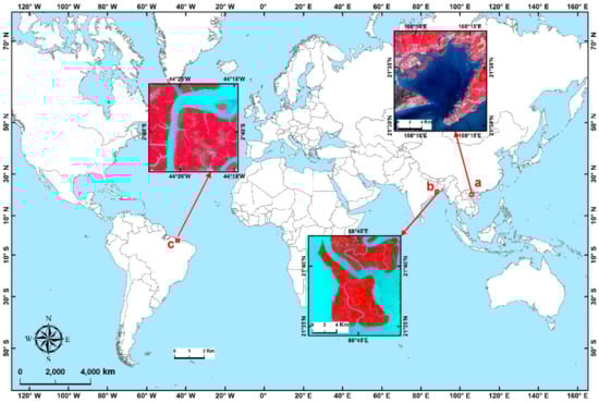 Global study sites of mangrove forests. (Displayed imagery: R:G:B = Sentinel MSI Band 8A: 4:3. (a) Zhenzhu Harbor, Guangxi, China; (b) Dalhousie Island, Sundarbans, India; (c) Baia do Arraial, Amazon Coast, Brazil).