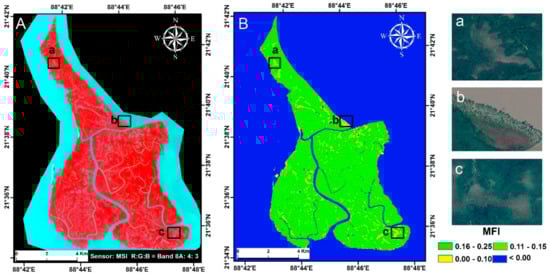 Apply the MFI to extract mangrove forests in Dalhousie Island, Sundarbans, India. (A) Sentinel MSI image (Band combination: R:G:B = 8A: 4: 3); (B) Sentinel MSI-based MFI image; (a–c): Google Earth snapshot.