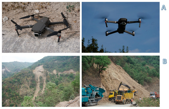 (A) The unmanned aerial vehicle (UAV) used to obtain remote sensing imagery for this study (a DJI Mavic 2 pro), and (B) field photographs of slope failures observed during a field visit to the Himalayas in April 2019.