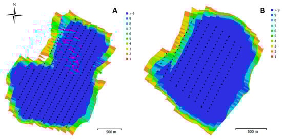 Camera locations and image overlap density: (A) training area, and (B) testing area. Blue areas indicate the highest overlap densities and red areas correspond to low overlap densities.