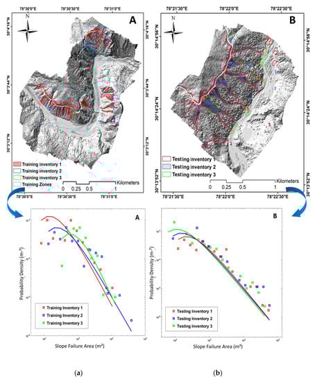 Dependence of the probability densities on the areas of three slope failure inventories for (a) the training area, and (b) the testing area.