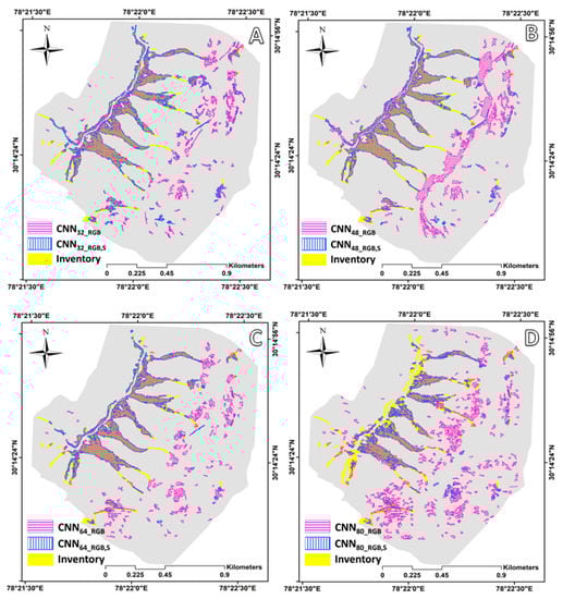 Landslide detection results using different CNN approaches, training datasets, and parameters. The CNN approaches have window sizes of (A) 32 × 32, (B) 48 × 48, (C) 64 × 64 and (D) 80 × 80, trained with optical data of RGB and also together with slope data.