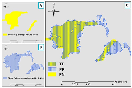 (A) Inventory of slope failure areas. (B) Slope failure areas detected by CNNs. (C) True positive (TP), false positive (FP) and false negative (FN) areas identified by comparing spatial overlaps between the polygons of (A,B).