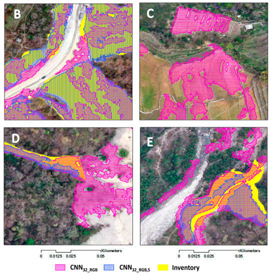 The CNN approaches using all of the above-mentioned parameters were trained using the selected inventory data set for the training zones and tested on the testing area. In all of the resulting maps we removed those detected slope failure areas that covered less than 144 m2 in order to reduce the geometric inaccuracies between the inventories and the UAV remotely sensed images. This area was the area of the smallest polygon in the inventory map chosen for the testing process. The results of a statistical analysis of the detected slope failures (i.e., minimum, maximum, sum, mean and standard deviation of the extracted areas) are presented in Table 4. A total of eight slope failure maps were generated on the basis of all the different CNN approaches and parameters used. Each of the presented maps (see Figure 11) shows the results obtained using the same sample patch window size with different RGB and RGB,S (RGB and slope) data sets, making it easier to distinguish the effects of using different training data sets and sample patches. Both results were overlaid on the chosen optimal testing inventory map. As an example, the approach used a window size of 48 × 48, and RGB,S indicates the use of a training data set comprising optical data from RGB layers, together with slope data.
