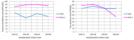 The and approaches resulted in the lowest F-scores, both having values of just over 59%. All CNNs apart from those that used a sample patch size of 80 × 80 pixels, yielded higher F-scores when the slope data was taken into account in the training and testing processes. The greatest increase in accuracy obtained by including the slope data was in the CNN with a sample patch size of 48 × 48 pixels, whose F-score increased by 2%; the mIOU value of results from the same CNN when including the slope data increased by about 35. The increases for CNNs with sample patch sizes of 32 × 32 and 64 × 64 pixels were smaller, at about 18 and 19 percent, respectively. The PPV for was 83%, whereas that for was 89.9%; their TPR values decreased to 78.46% and 81.85%, respectively.