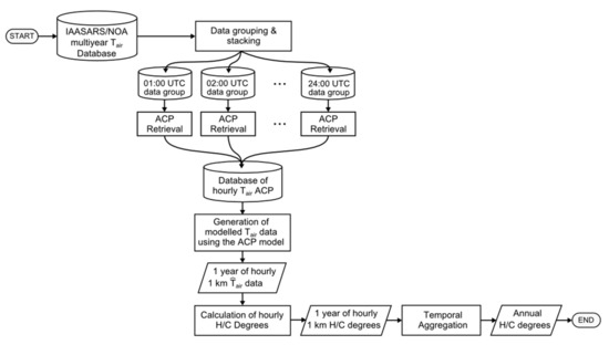 Overall, satellite thermal image data describe the spatial heterogeneity of the urban thermal environment in much greater detail than spatially interpolated weather station measurements [7]. Hence, satellite data can provide the basis for a more physically realistic HD and CD data product. Typically, computer simulations of buildings and solar energy systems [49,50] use test reference years (TRYs) and typical meteorological years (TMYs), which represent a year of hourly weather data values. TRYs and TMYs are extracted from long-term data records (a minimum of 10 years), do not provide information on extreme events, and do not necessarily represent actual conditions at any given time. However, because the IAASARS/NOA archive of surface air temperatures covers only the last few years, it is not possible to extract TRYs or TMYs for each 1 × 1 km pixel. As a partial workaround to this problem, the input multiyear IAASARS/NOA surface air temperatures are aggregated to a synthetic one-year time series of average-like hourly values using the ACPs. This way it is possible to remove the extreme values from the input surface air temperatures and produce an HD and CD dataset that reflects the current average conditions.