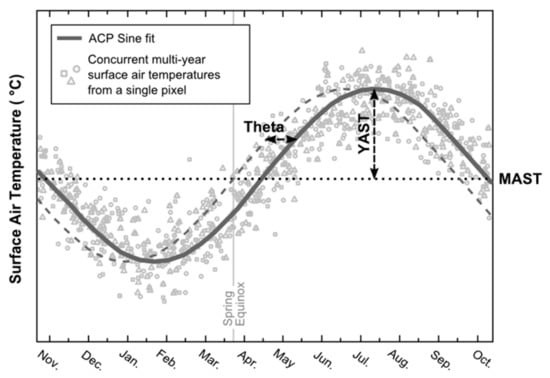 For midlatitude regions, like Europe, the annual cycle of the surface air temperature can be approximated by a sinusoid function [33]. This work takes advantage of this property and aggregates the multiyear IAASARS/NOA dataset to 24 sets of annual cycle parameters (ACPs)—one set for each hour of the day. The ACPs provide a generalized characterization of the temperature’s temporal dynamics and a gap-free representation of the surface’s thermal characteristics [24,34,35] and are: the mean annual surface temperature (MAST, in °C), the yearly amplitude of surface temperature (YAST, set by definition to be ≥ 0 °C), and the phase shift relative to the spring equinox (theta, set by definition to range between −182.5 and +182.5 d). These three parameters are retrieved by modelling the annual temperature cycle of each pixel using a harmonic (sine) function that is then reduced to the MAST, YAST, and theta parameters, as shown in Figure 2 [35,36]. To retrieve the ACPs for this work, the multiyear IAASARS/NOA dataset is first divided in 24 subsets (one subset for each hour of the day), and then the multiyear data of each subset are stacked according to the day of year (DOY = [1, 2, …, 365]). The sine fitting is then performed for each subset separately, using a least-squares optimization on a pixel-by-pixel basis, and results in 24 sets of corresponding MAST, YAST, and theta raster layers.