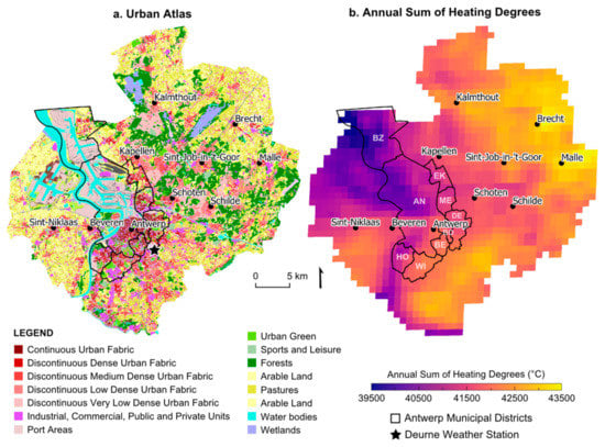 Antwerp is a major port city in Belgium and one of the three validation cities of PLANHEAT. It is the capital of the Antwerp Province in the community of Flanders and on 1 January 2018 had a population of 523,245 people. Its metropolitan area accommodates approximately 1,200,000 people, which is surpassed in Belgium only by Brussels. Antwerp’s functional urban area (FUA) covers an area of 1187.03 km2, and according to the 2012 European Urban Atlas (UA) dataset [39] the most dominant land cover and land use (LCLU) classes are pastures (21.5%), arable land (15.6%), discontinuous urban fabric (14.4%), forests (11.8%), industrial and commercial units (6.5%), water (5.7%), port areas (5.2%), urban green (2.1%), and continuous urban fabric (2.0%). The Municipality of Antwerp covers an area of 204.51 km2 and is located on the River Scheldt, which discharges into the North Sea via the Westerschelde estuary. Antwerp is divided into nine municipal districts, and its port area is one of the 20 largest ports in the world, ranking third in Europe. According to the Köppen climate classification, Antwerp’s climate is oceanic (Köppen: Cfb) with cool summers and cool, but not cold, winters and with a relatively narrow annual temperature range. The mean annual surface air temperature is 10.6 °C, and the warmest and coldest months are July (18.5 °C) and January (3.4 °C), respectively (Table 1).