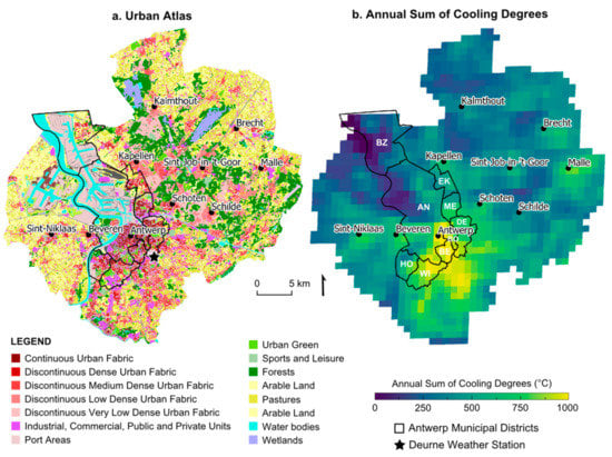 (a) The 2012 Urban Atlas LCLU for Antwerp’s FUA and (b) the PLANHEAT aggregated (annual sum) CD calculated using a base temperature of 22.0 °C.