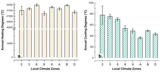 The mean and values for the dominant local climate zones (LCZs) of Antwerp’s FUA are presented in Figure 5 (the LCZ data used here are the World Urban Database and Access Portal Tools, WUDAPT, level-0 data [40,41] for Antwerp, aggregated to PLANHEAT’s 1 × 1 km grid using a majority filter). The LCZ is a standardized, comprehensive, climate-based classification of urban and rural sites for temperature studies [42]. Antwerp’s FUA includes LCZs 2, 3, 6, 8, 9, 10, A, B, and D [43]. The first two correspond to compact mid- and low-rise urban areas with tightly packed buildings and little or no green spaces. LCZs 6 and 9 correspond to areas with sparsely arranged buildings and an abundance of trees and pervious cover, whereas LCZs 8 and 10 correspond to areas with large structures (e.g., for industrial use) with few or no trees and mostly paved surfaces. Lastly, LCZs A, B, and D correspond to forested and low plant areas. Figure 5a shows that in the residential areas (i.e., LCZs 2, 3, 6, and 9) the increases as the urban fabric becomes less dense with lower buildings and the vegetation more abundant. In addition, in the port area, which corresponds to industrial and large low-rise LCZs, the are the lowest, while in the vegetated rural and forested areas (i.e., LCZs A and B) they are the highest. The mean values present the opposite picture, as it can be seen in Figure 5b. Specifically, the residential LCZs that need the most cooling are LCZs 2 and 3, which are tightly packed with mid- and low-rise buildings, and the ones that require the least cooling are LCZs 6 and 9 that have plenty of vegetation and sparsely arranged buildings. In addition, the LCZs with the lowest mean values are the natural classes A, B, and D.