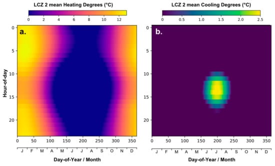 The hourly mean (a) HD (base temperature: 15.5 °C) and (b) CD for Antwerp’s LCZ 2.