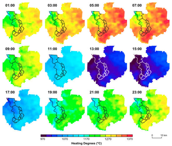Last but not least, the change of Antwerp’s HD spatial patterns during the course of a day is presented in Figure 7. The HD of this figure refers to the time period between 1 October and 31 March—when the most heating is needed (used in [15])—and are equal to the pixelwise sum of the corresponding 1 × 1 km hourly HD. In agreement with Figure 6, the HD peak is at around 06:00 UTC and is at a minimum around 15:00 UTC. The HD spatial patterns are strongest during the nighttime and the least pronounced during daytime. The rural areas south and east of Antwerp exhibit the highest HD values, especially between 03:00 and 07:00 UTC, while the port area of Antwerp and the areas adjacent to the River Scheldt exhibit the lowest HD values throughout the day. According to Figure 7, at noon (11:00–15:00 UTC) the nine municipal districts of Antwerp exhibit similar HD values and no distinct major spatial features. Antwerp’s HD spatial patterns start to strengthen after 19:00 UTC and peak at around 07:00 UTC. In particular, the HD of the municipal districts of WI, BE, and BO, which are located at the southern side of Antwerp’s municipality (see Figure 3 or Figure 4) increase faster than that of the other municipalities; they peak at a higher value and have higher HD values with respect to the other districts throughout the night. This is attributed to the lower intensity of the UHI effect near the city outskirts. Similarly, the municipal districts of EM, ME, and DE, which are located at the eastern side of the municipality, also have high HD values throughout the night. On the other hand, the district of Antwerp, which is located at the center of the city and includes most of Antwerp’s port area, has the lowest HD values throughout the day. To that end, at nighttime there is a clear difference between the residential and port area HDs, which most probably is due to UHI effects and the presence of water at the port area.