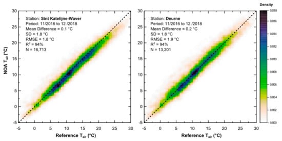 Figure 8 presents the results of the first validation stage and shows that the IAASARS/NOA surface air temperatures agreed well with the corresponding in situ measurements for both the Sint Katelijne-Waver and the Deurne stations (Figure 8a,b, respectively). In detail, the mean difference was close to 0 °C for both stations, and the standard deviation (SD) was equal to 1.8 °C. The RMSE for Sint Katelijne-Waver was 1.8 °C and was 1.9 °C for Deurne, while the squared correlation coefficient (R2) was equal to 94% for both. The aforementioned statistics have been calculated from 16,713 comparisons for Sint Katelijne-Waver and 13,201 for Deurne.