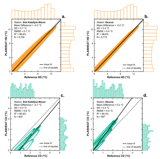The results of the second validation stage are presented in Figure 9. In particular, Figure 9a,b present agreement between the PLANHEAT and the in situ hourly HD (base temperature: 15.5 °C) for Sint Katelijne-Waver and Deurne, respectively; while Figure 9c,d present agreement for the corresponding hourly CD (base temperature: 22.0 °C). The validation results suggest that, for Antwerp, the PLANHEAT HD agreed quite well with the reference HD for both stations. Specifically, the mean difference was −0.3 °C for Sint Katelijne-Waver (5750 comparisons) and −0.2 °C for Deurne (5712 comparisons), while the corresponding SDs were 0.7 °C and 0.4 °C, respectively. The RMSE and the R2 for Sint Katelijne-Waver were 0.7 °C and 96.6%, respectively, and for Deurne they were 0.4 °C and 98.6%, respectively (Figure 9a,b). Validation of the hourly CD data for Antwerp revealed that the CD mean difference and SD for Sint Katelijne-Waver (503 comparisons) were −0.7 °C and 0.3 °C, respectively, and for Deurne (597 comparisons) +0.3 °C and 0.4 °C, respectively. The corresponding RMSE and R2 values were 0.8 °C and 80.6%, and 0.4°C and 90.3%, respectively (Figure 9c,d).