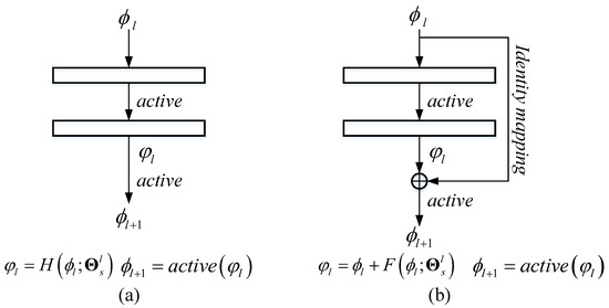 To further explain the residual block, we exhibit a comparison between the fully connection block and the residual block in Figure 4. Figure 4a shows a normal fully connection block. The output of the th block can be obtained using mapping function directly. In contrast, the output of the th residual block (displayed in Figure 4b) should be acquired by the summation of and results of .