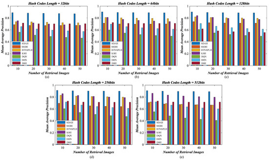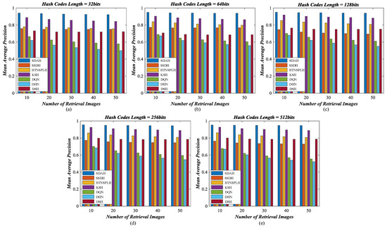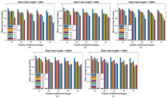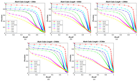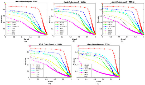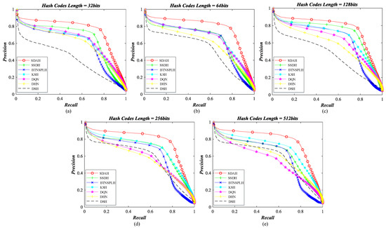 We selected precision–recall (P-R curve) and mean average precision (MAP) to verify SDAH’s retrieval behavior numerically. Assume that we obtain retrieval results for a query image . The number of correct retrieval results is , and the number of the correct target images within the archive is . Thus, the precision and recall can formulated as and . Here, we define that a retrieved/target image is correct if it belongs to the same semantic category as query. Furthermore, let us impose the labels on the results. If the retrieved image is correct, , and otherwise . Then, MAP can be defined as