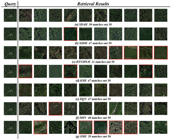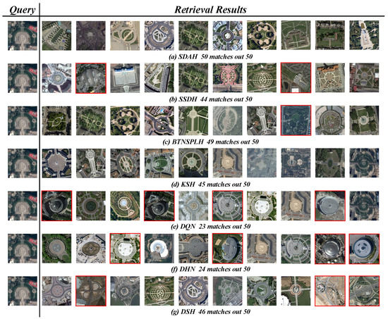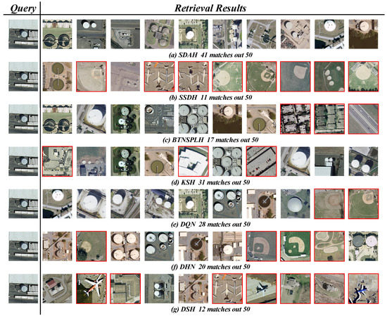 We selected three published RS archives (UCM, AID, and NWPU) to verify the usefulness of our SDAH. First, our model can learn the hash codes from different visual features, including the mid-level BOW vectors and the high-level deep vectors (AlexFC7, VGG16FC7, AlexFineFC7, and VGG16FineFC7). In addition, the retrieval performance of learned hash codes is better than that of the original visual features. In general, enhancements of around 10% can be achieved. Second, we compared our SDAH with six other popular hash learning methods (SSDH, BTNSPLH, KSH, DQN, DHN, and DSH). Fixing the input feature (AlexFineFC7) and the length hash codes (128 bits), the MAP values of our SDAH counted on Top 50 retrieval results are 0.8286 (UCM), 0.9394 (AID), and 0.8855 (NWPU), which are higher than those of the comparison methods. Third, the learned hash codes can obviously speed up the retrieval efficiency compared with the original visual features. The promising experimental results counted on different RS image datasets prove that our SDAH is effective to the RSIR task.