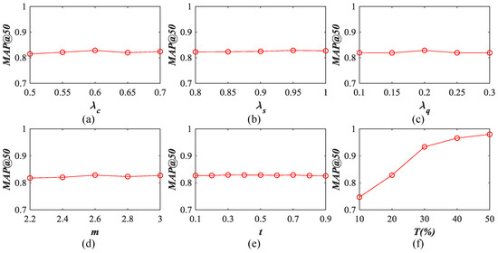 The performance of our SDAH model based on different visual features was studied. Considering the characteristics of RS images, we selected five visual features to represent RS images:, SIFT-based BOW features [70], the outputs of the seventh fully connected layer of Alexnet [31] and VGG16 [74], and the outputs of the seventh fully connected layer of fine-tuned Alexnet and VGG16. These features are common in the RS community [43,75,76]. Here, we refer to them as BOW, AlexFC7, VGG16FC7, AlexFineFC7, and VGG16FineFC7, respectively, for short. Among those features, BOW is mid-level and theothers are high-level features. To be fair, their dimension was set to 4096. In addition, 80% of images from RS archives were selected randomly to fine tune two deep networks for feature extraction. As mentioned above, the parameters (m, , , and ) of our model depend on the different input visual features. After the k-fold cross-validation, the optimal parameters for different features and different RS image archives are displayed in Table 5.