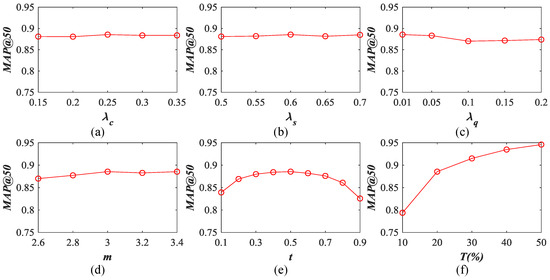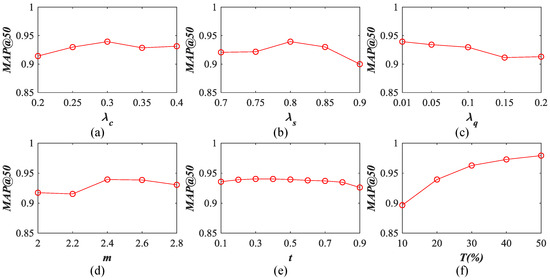 To generate the hash code using our SDAH, some preparatory work should be completed in advance. First, the structure of SDAH should be decided. Suppose the dimension of input data is d, the number of semantic classes is c, and the bit of expected hash codes is K. Then, our hashing network structure is summarized in Table 4. Second, the training data for SDAH need to be prepared. We randomly selected 20% of images from the original dataset to be the training data. The influence of training data with different proportions is discussed in Section 5.4. Third, the visual features of the RS images need to be extracted. Here, to prove the effectiveness of SDAH, we adopted five common visual features. The details of the performance based on these visual features are discussed in Section 5.2. Fourth, the values of some parameters need to be decided, including the margin parameter m (Equation (12)), and the weighting parameters , and (Equation (16)). All of the parameters were tuned by the k-fold cross-validation in this study. For various RS image archives and diverse visual features, the optimal parameters are different. The details are displayed in Section 5.2. In addition, we used the Adam algorithm [73] to optimize our adversarial hashing network. The learning rate and iteration were set to and 50, respectively. All experiments were accomplished using an HP 840 high-performance computer with GeForce GTX Titan X GPU.