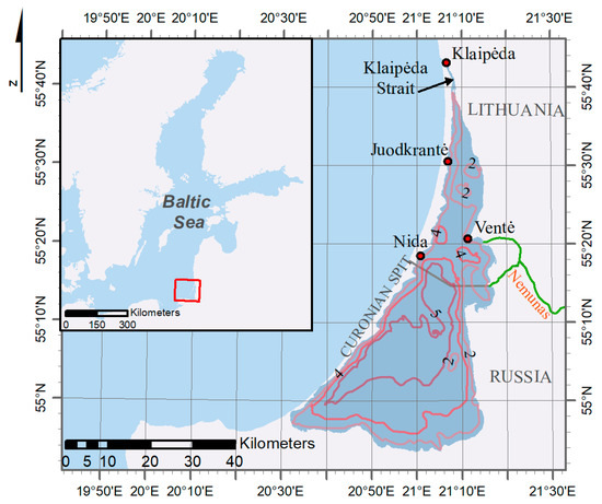 Location of the study area–the Curonian Lagoon, with respect to the Baltic Sea. The red frame in the smaller map shows the location of the lagoon in the southeastern part of the Baltic Sea, while the red points indicate the locations of the coastal stations. The contour lines inside the lagoon indicate the bathymetry.