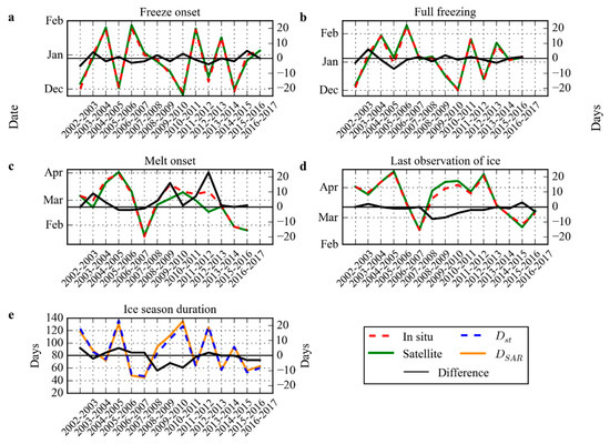 Intercomparison of the (a) freeze onset (FO), (b) full freezing (FF), (c) melt onset (MO), (d) last observation of ice cover (LOI) dates, and (e) ice season duration ( and ) derived from the satellite observations (solid lines) and in situ records (dashed lines), and the time difference between them (black solid line).