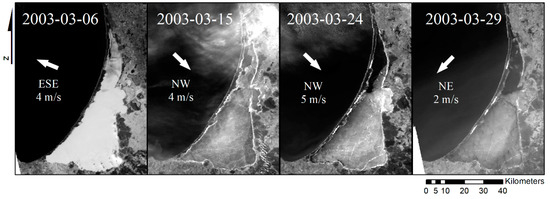 MODIS images of the ice cover retreat in the northern Curonian Lagoon during the winter of 2002–2003. Labels and arrows indicate the wind speed and direction.