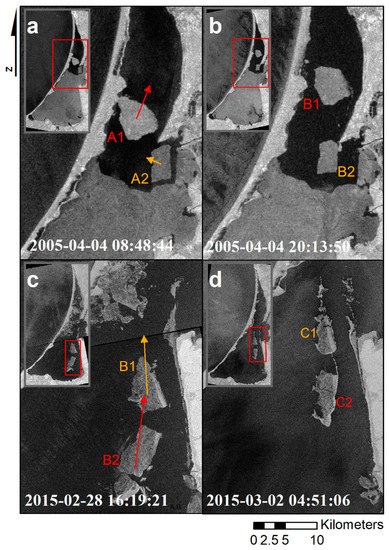 Examples of the ice drift in the Curonian Lagoon observed in the SAR images. Envisat ASAR images of the two ice floes in the Lithuanian part of the Curonian Lagoon taken on 4 April 2005 at 8:48:44 UTC (a) and at 20:13:50 UTC (b). Sentinel-1A images of the ice floes in the Russian part of the lagoon acquired on 28 February 2015 at 16:19:21 UTC (c) and 2 March at 04:51:06 UTC (d).