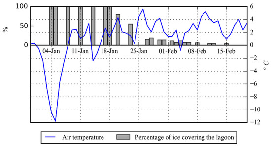 The ISD values in 2006–2007 and 2007–2008 are the shortest during the entire study period, lasting for 51 and 47 days, respectively (Table 2). Nonetheless, the full ice cover is still able to form during such a relatively short period. The winter of 2007–2008 has a very pronounced decrease of air temperature in the beginning of the season when Ta drops from 1 °C down to −11.8 °C between 29 December 2007 and 5 January 2008 (Figure 7). Full freezing of the lagoon is recorded on 4 January 2008, while in a few days the air temperature rises again above zero. The ice break-up and final melting starts on 20 January 2008 lasting for 28 days out of 47 days of the total ice season duration. The last ice traces are observed on 15 February 2008. The cumulative negative air temperature for this season is only = −46 °C, while the spatially‑mean ice season duration, , is only 22 days—record low values over the entire study period.