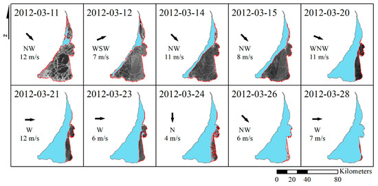 The ice season duration in 2011–2012 is more than twice shorter than that of the previous winter (65 days) and has a very late start at the end of January 2011. Nevertheless, the lagoon has frozen quite rapidly and remained such for more than a month due to the very low air temperatures dropping down to −23 °C ( = −346.02 °C). The high temporal resolution of the SAR images of the lagoon allows observing how graciously the ice retreats from the western shoreline to the eastern one, and then finally disappears in the southeastern corner (Figure 8). As one may note, the ice melt direction and its overall pattern are clearly shaped by the direction of the prevailing moderate-to-strong westerly and northwesterly winds. The duration of the melting period is similar to the previous years and lasts about 28 days.