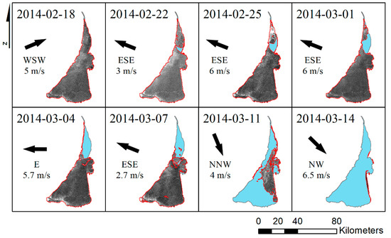 The consecutive winter (2012–2013) is nearly twice longer and has multiple freezing and melting periods. The final melting duration lasts for more than 50 days, while the overall ISD is one of the longest, 129 days (Table 2). In 2013–2014 ice covers the lagoon for about one month only. The ice melt starts from the eastern shoreline in the northern part of the lagoon. The observed melting pattern matches exactly one of the prevailing winds. As seen in Figure 9, the moderate easterly wind acting for about two weeks after the melt onset makes the melting pattern spread first along the north-eastern coast and finally opening the entire northern part two weeks later. Once the wind changes to the NW direction, the ice cover starts melting in the southern part and accumulates in the central eastern part of the lagoon, where it stays longest until the final retreat. The total duration of the ice season was 57 days (Table 2), i.e., about two months shorter than during the previous season.
